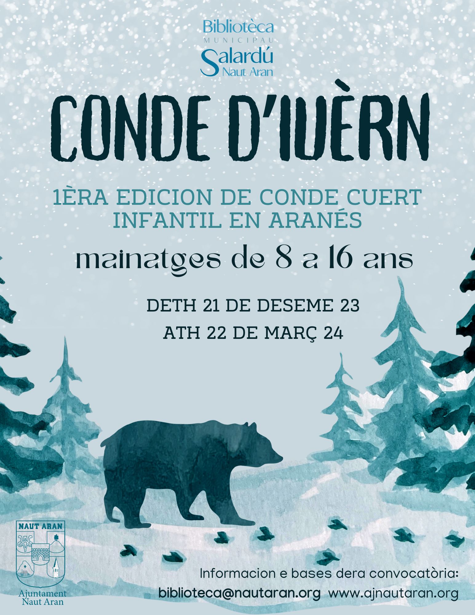 La Biblioteca municipal de Salardú i l’Ajuntament de Naut Aran convoquen la primera edició de Conte d’Hivern, qu’té com objectiu promoure la creació literària en l’aranès entre la mainadera, mitjançant el format de conte curt.