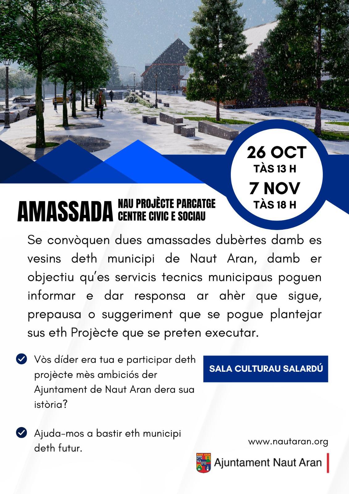 Es convoquen dues reunions obertes amb el veïnat del municipi de Naut Aran, que es duran a terme els dies 26 d’octubre de 2023 a les 13.00 hores i el dia 7 de novembre de 2023 a les 18.00 hores a la Sala Cultural (carrer de Santa Cruz, s/n) de Salardú, amb l’objectiu que els serveis tècnics municipals puguin informar i donar resposta a qualsevol qüestió, proposta o suggeriment que es pugui plantejar respecte al Projecte que es pretén executar