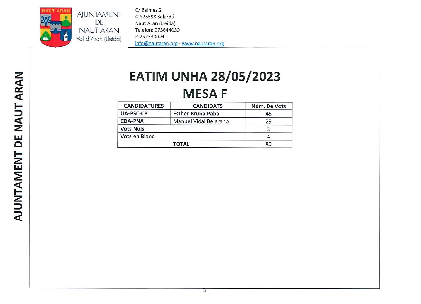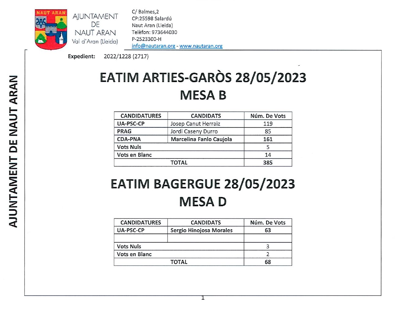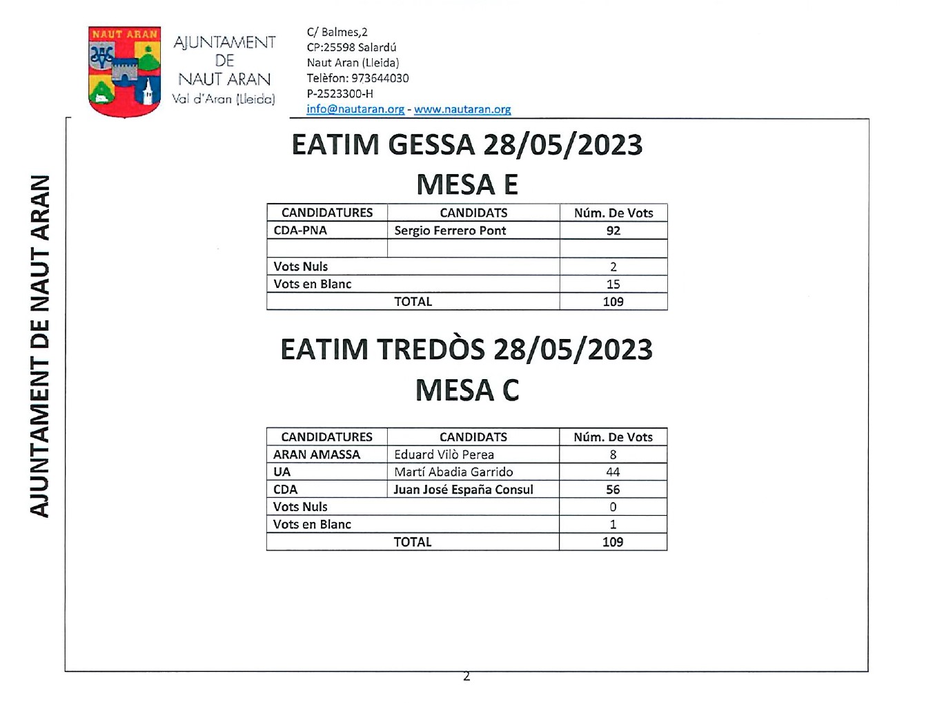 Listat de meses per locau electorau Naut Aran