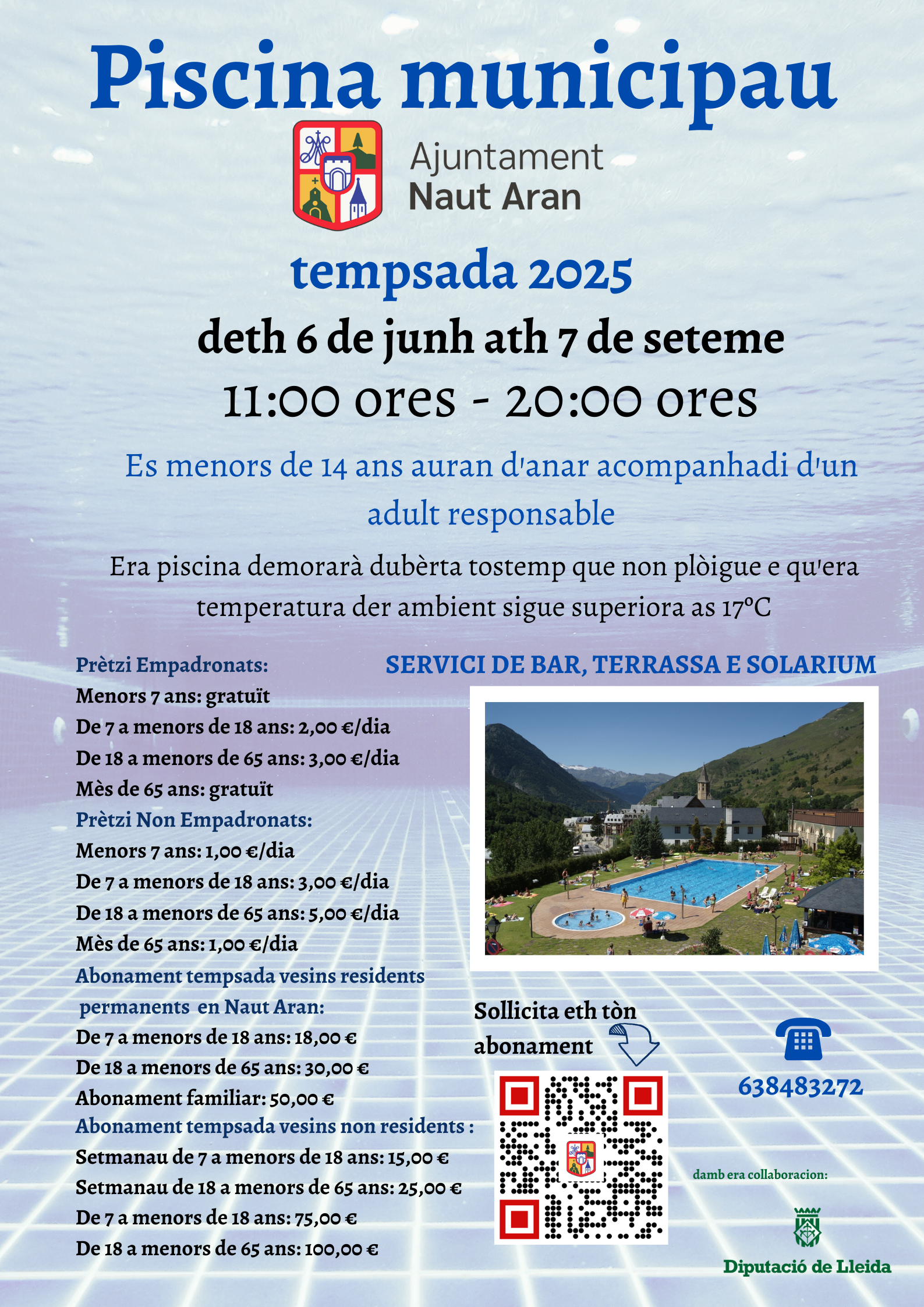 Mes informacion en Ajuntament de Naut Aran en ores d’oficina o ena madeisha piscina en numero 638483272