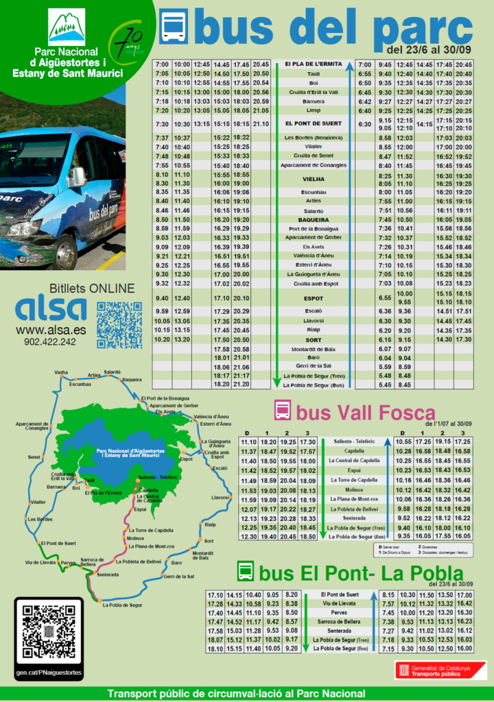 Aguest 2025 er Autobús deth Parc serà operatiu deth 23 de junh ath 30 de seteme, e a compdar de l’1 de junhsèga en tram comprenut entre la Pòble de Segur e l’embassament de Sallente, en tot coïncidir damb eth periòde de foncionament deth telefèric dera Val Fosca.